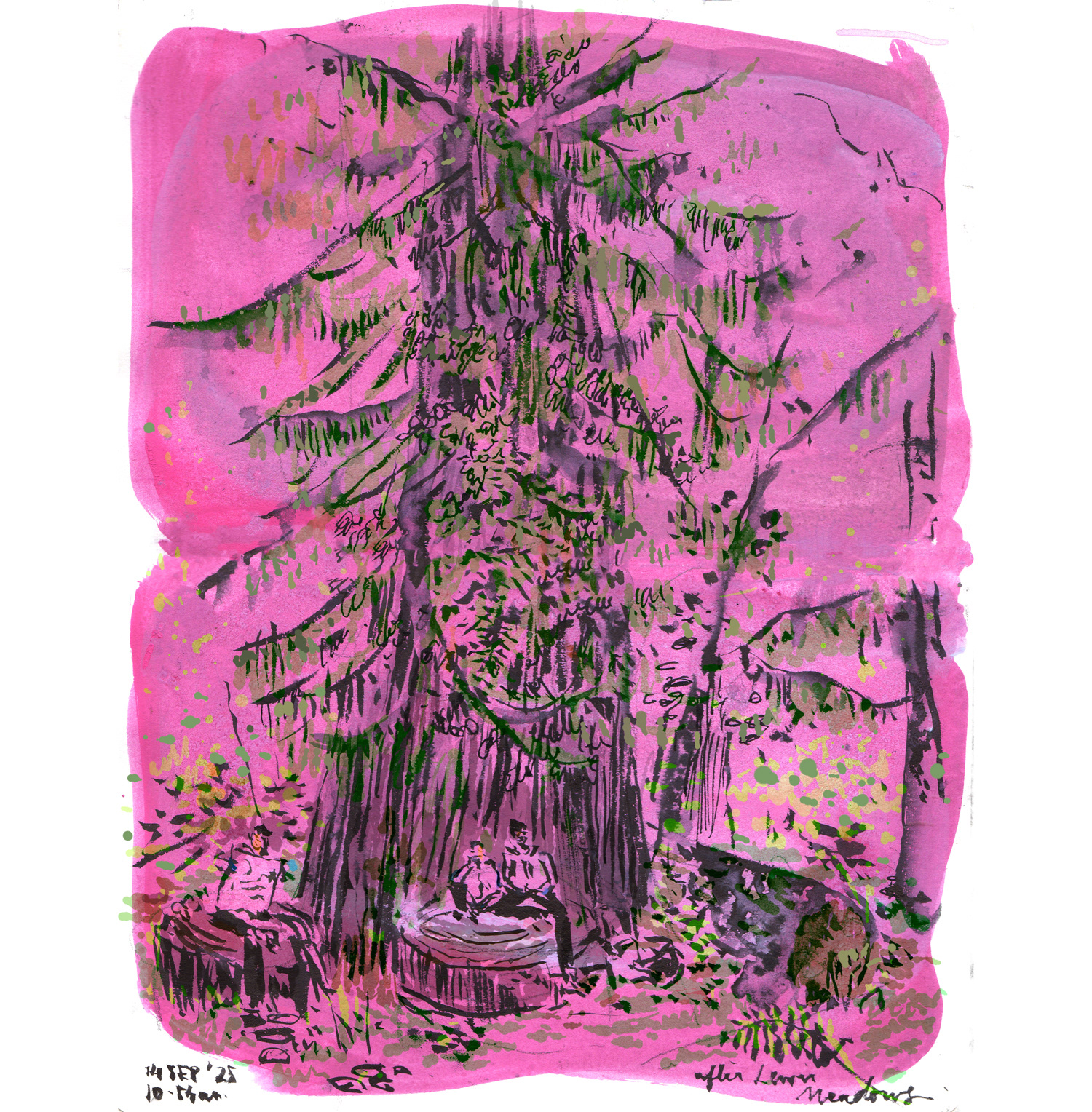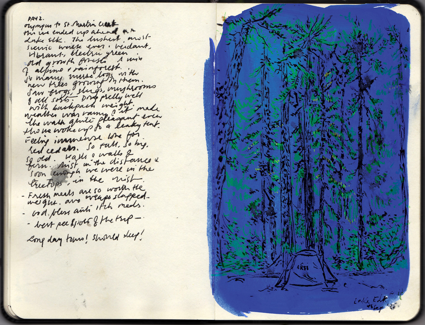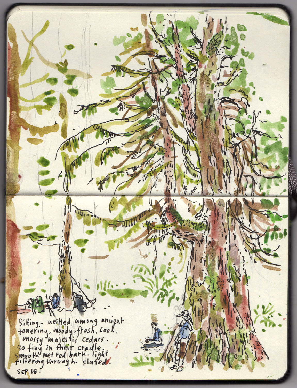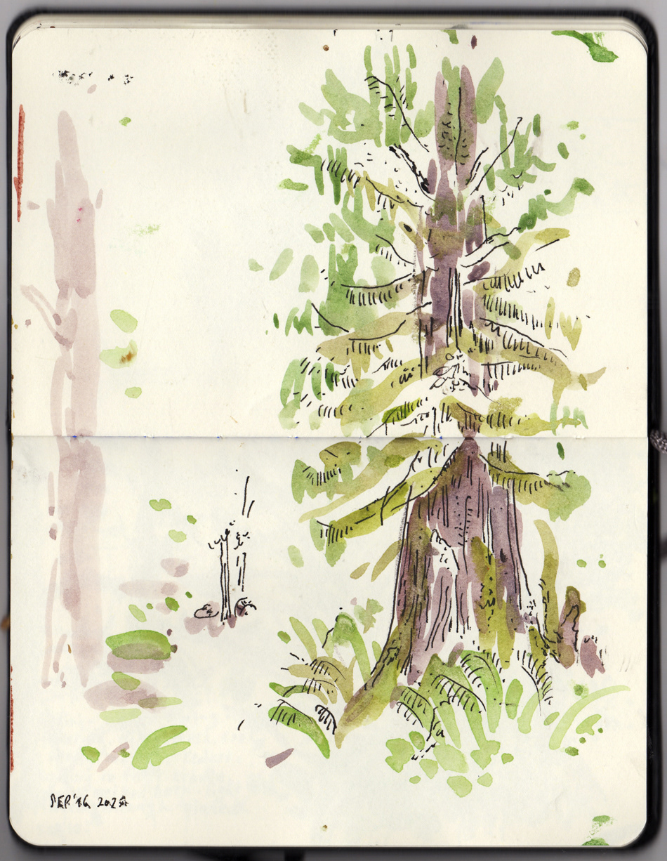 I drew Sitka Spruces, Douglas-firs, moss draped Maples and heady, woody and ancient Western red cedars.
