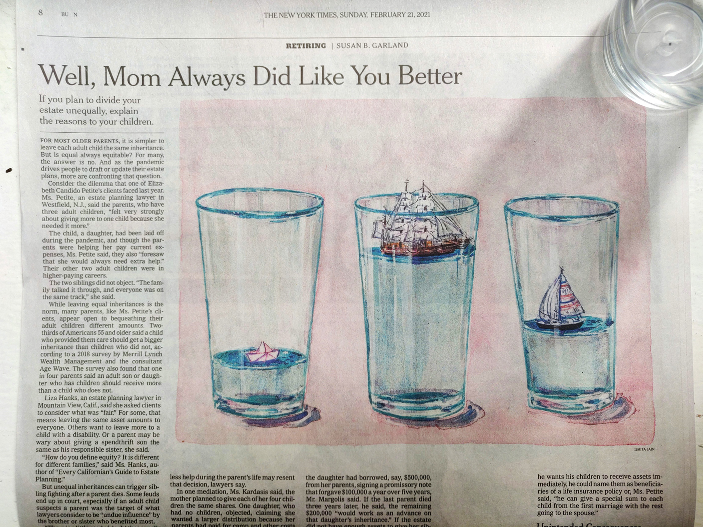 was about how parents often leave behind unequal inheritances and it appeared in the Sunday Business section of the NYTimes.